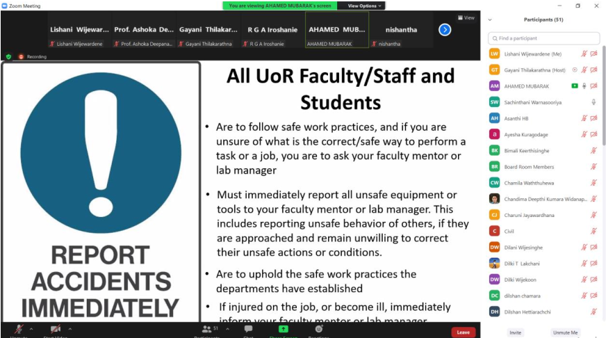 The workshop on Laboratory Safety was held on 18th January 2023 from 9.00 -12noon (virtual). The workshop is organized by Sri Lanka Accreditation Board.